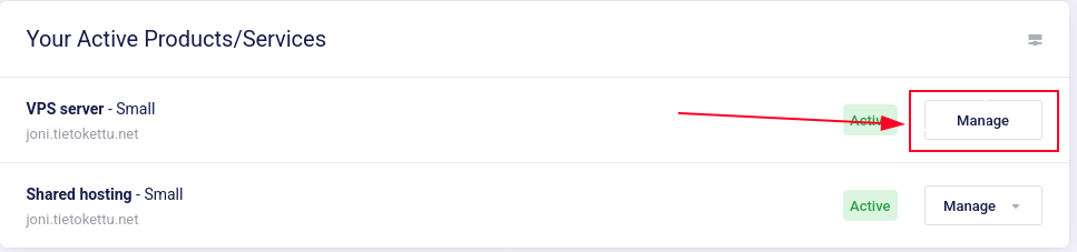 Scroll down the page until you find the "Active Services" section. Click "Manage" under Virtual Servers.