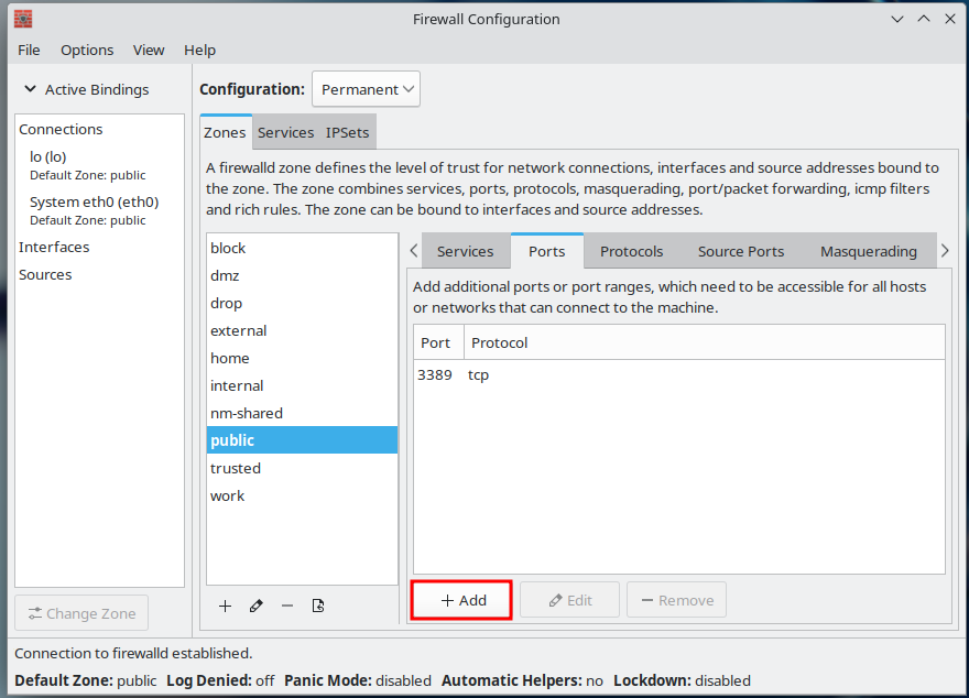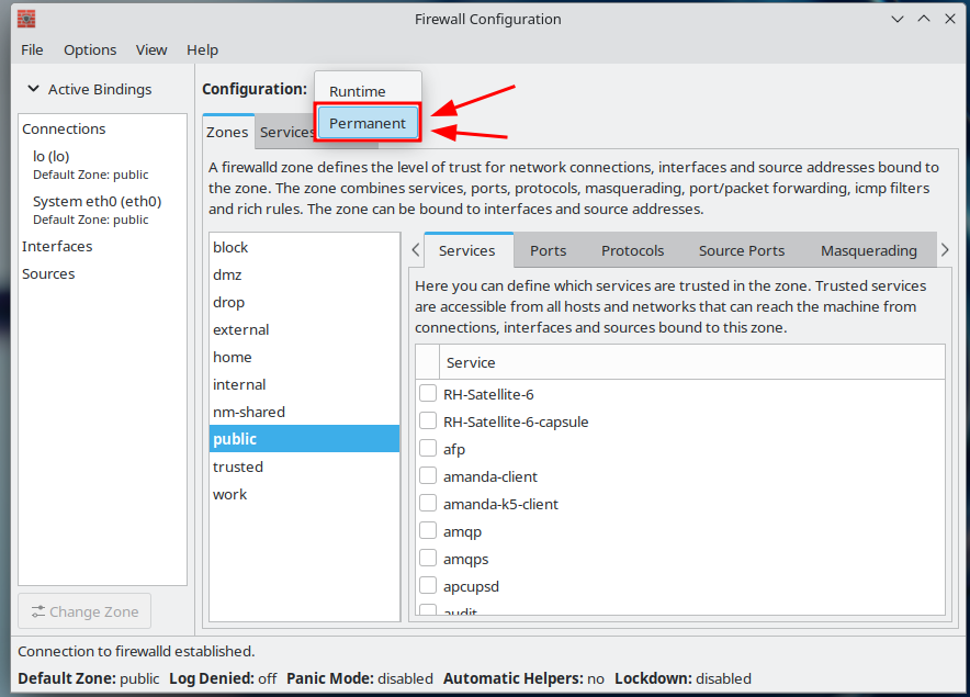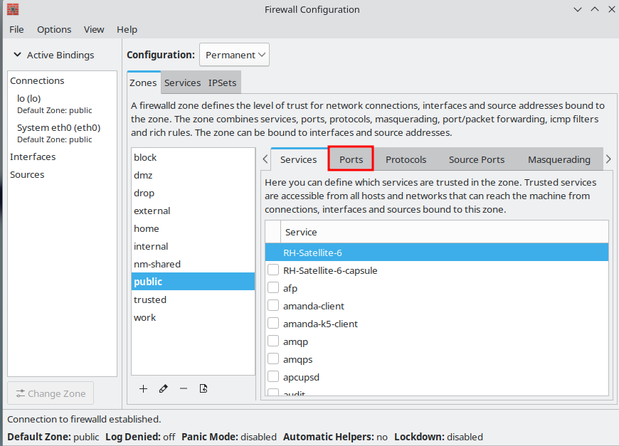 Laita Configuration kohdasta päälle Permanent jotta laittamasi portit pysyvät uudelleen käynnistyksen jälkeen