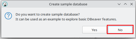 Kun DBeaver avautuu paina Create sample database kohdassa No