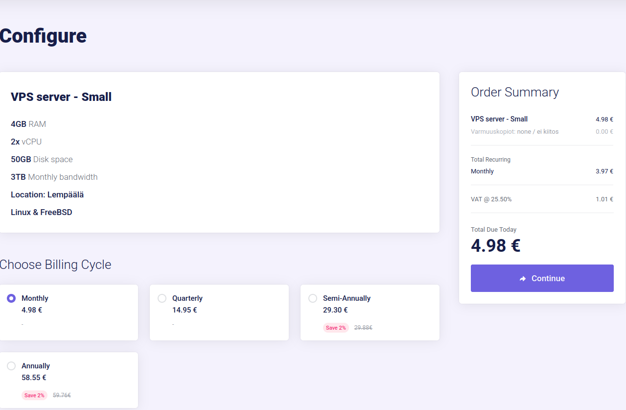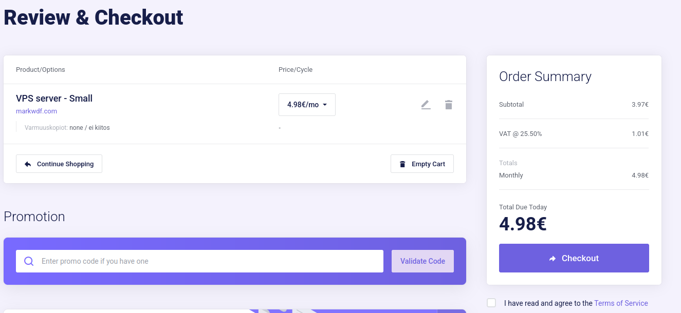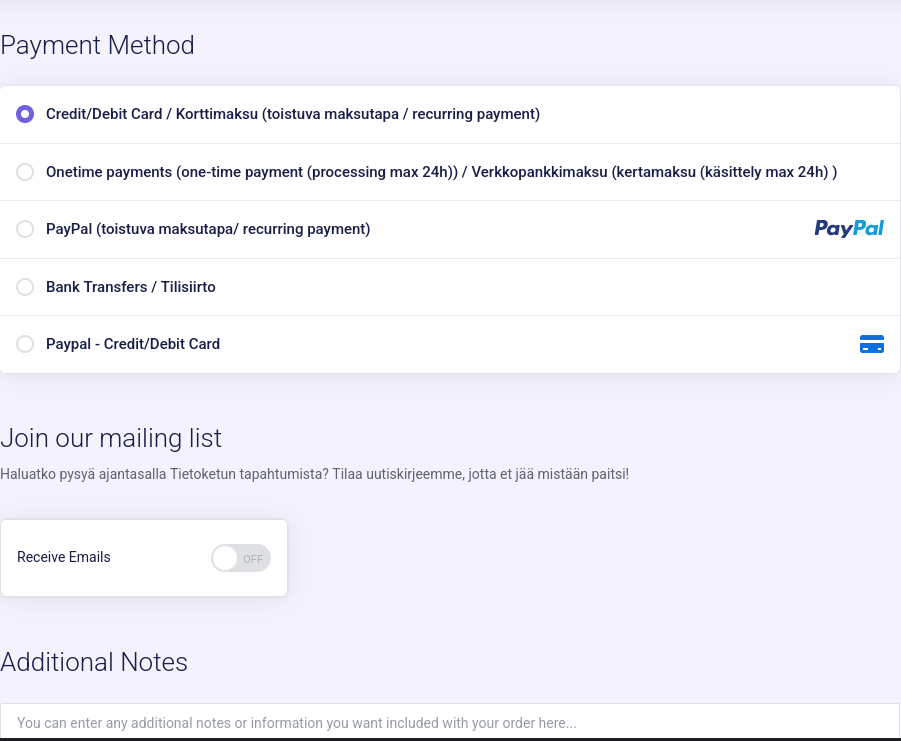 On this tab, you can review your order details and apply a discount code if you have one. Discount codes are occasionally published on Tietoketun social media. and Discord-server