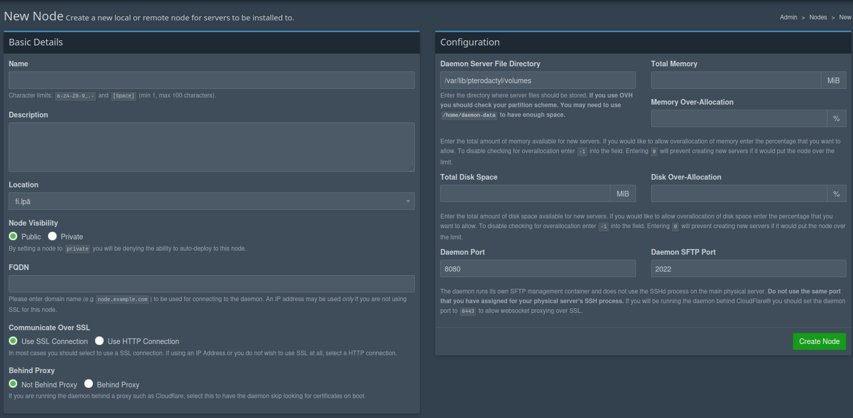 Sitten näät tämän näköisen sivun johon sinun pitää laittaa sivusi/ip osoite ja konfiguroida kuinka paljon laitat nodelle tilaa ja muita sen tapaisia