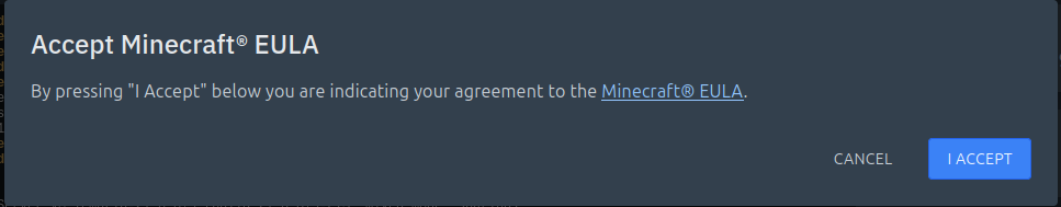Kun aloitat ensimmäistä kertaa serverisi saat tämän näköisen josta voit painaa I ACCEPT jonka jälkeen voit mennä Minecraftiin.