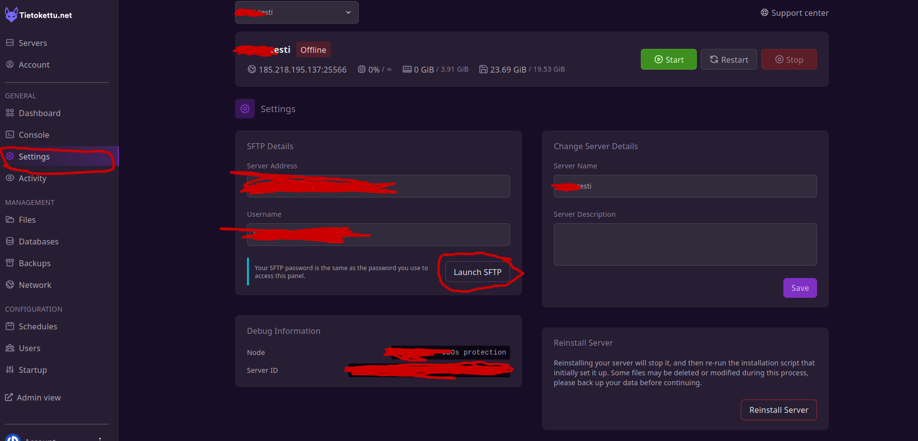 2. To connect to your server, you will need the SFTP address, username, and panel password.