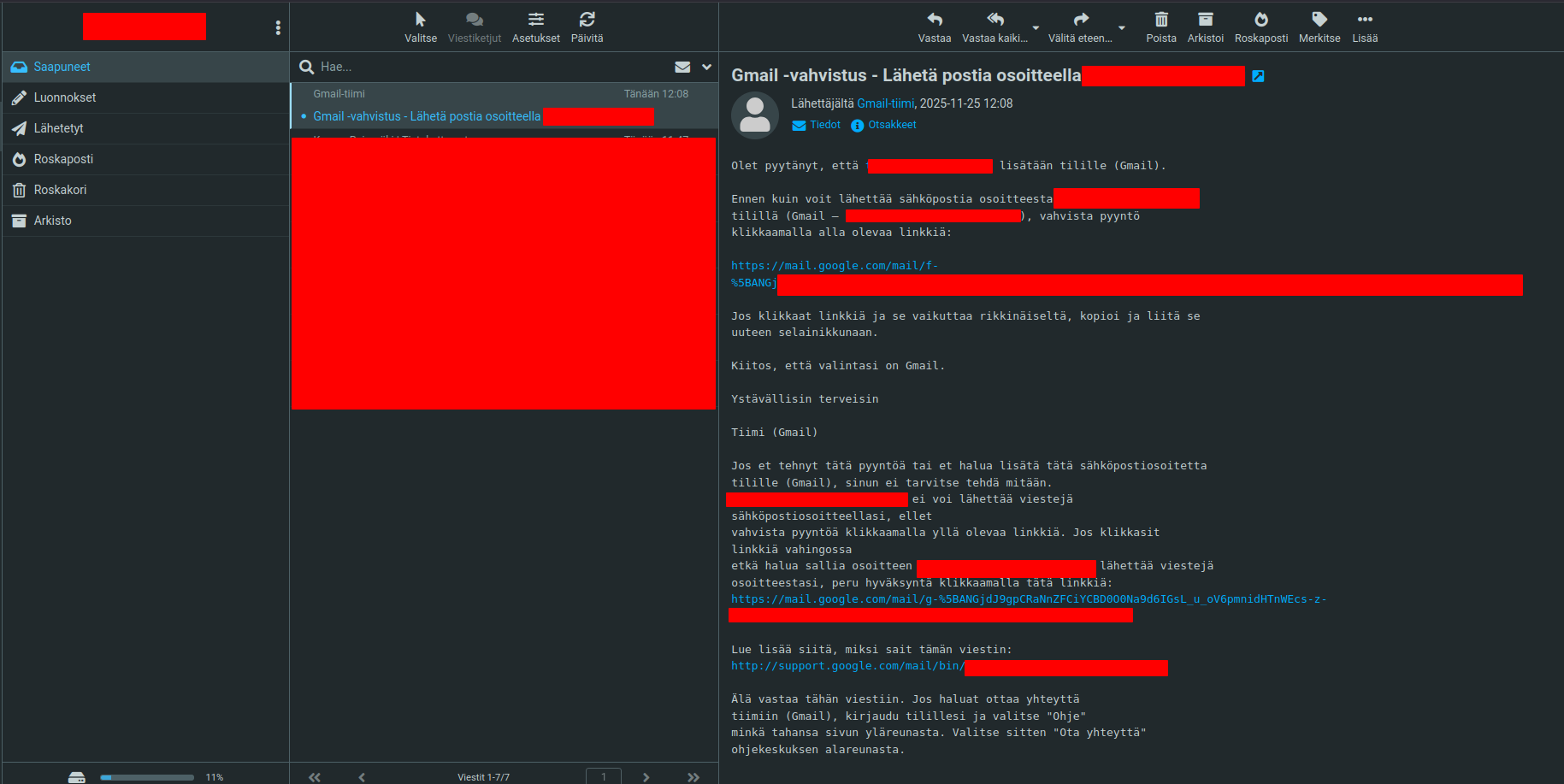 13. Sinulla pitäisi olla tällainen näkymä, kun olet päässyt webmailiin. Klikkaa seuraavaksi gmail tiimin lähettämään vahvistuslinkkiä