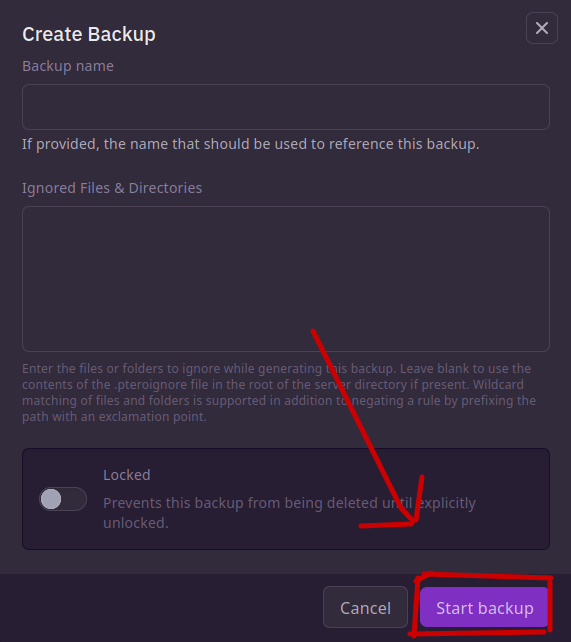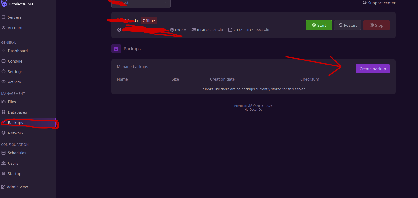 4. If you purchased backups for your server, now create one from the "Backups" tab by clicking "Create Backup".