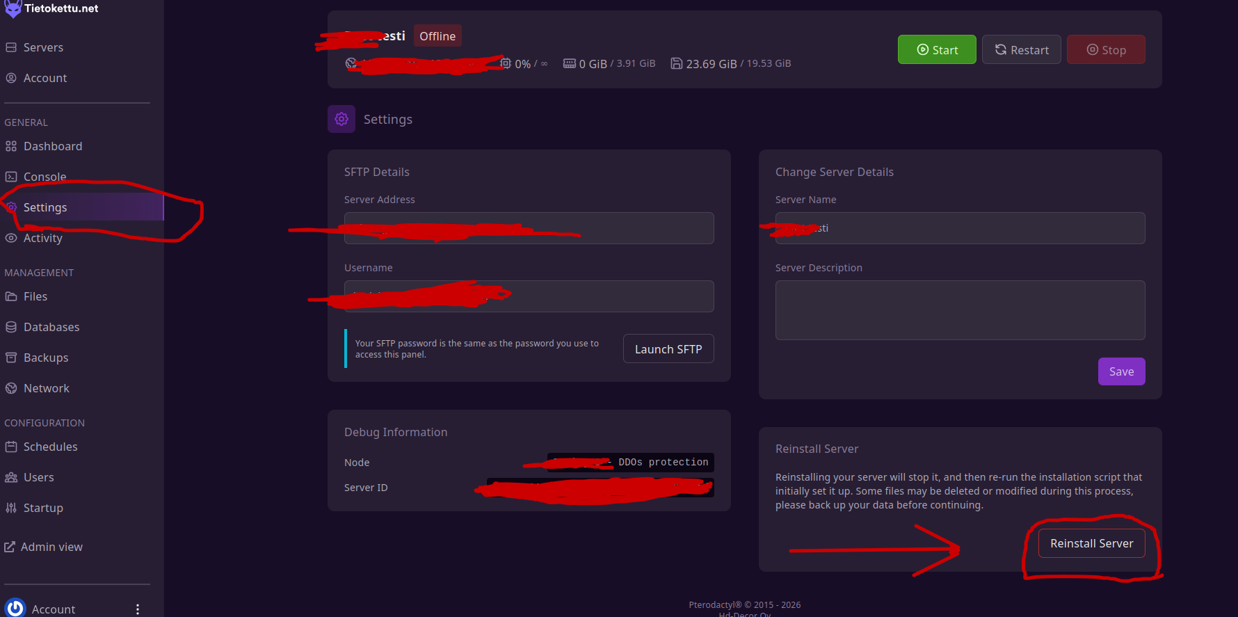 5. Now we will reinstall the server. Go to the "Settings" tab, and click on "Reinstall Server" in the bottom right corner.
