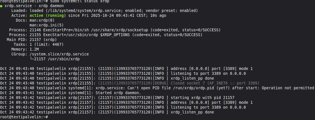 Tarkista, onko xrdp-palvelin toiminnassa komennolla:
