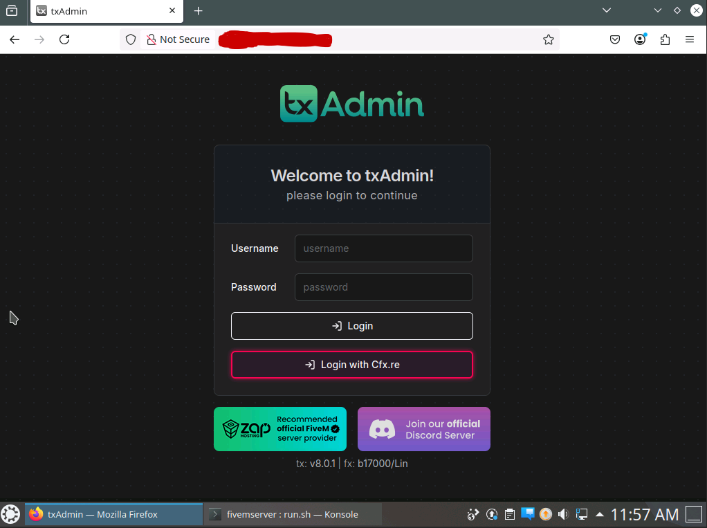 (laita palvelimen IP kohdalle oman palvelimen IP) jonka jälkeen voit kirjautua sisään fivem palvelimellesi txAdmininiin tunnuksillasi
