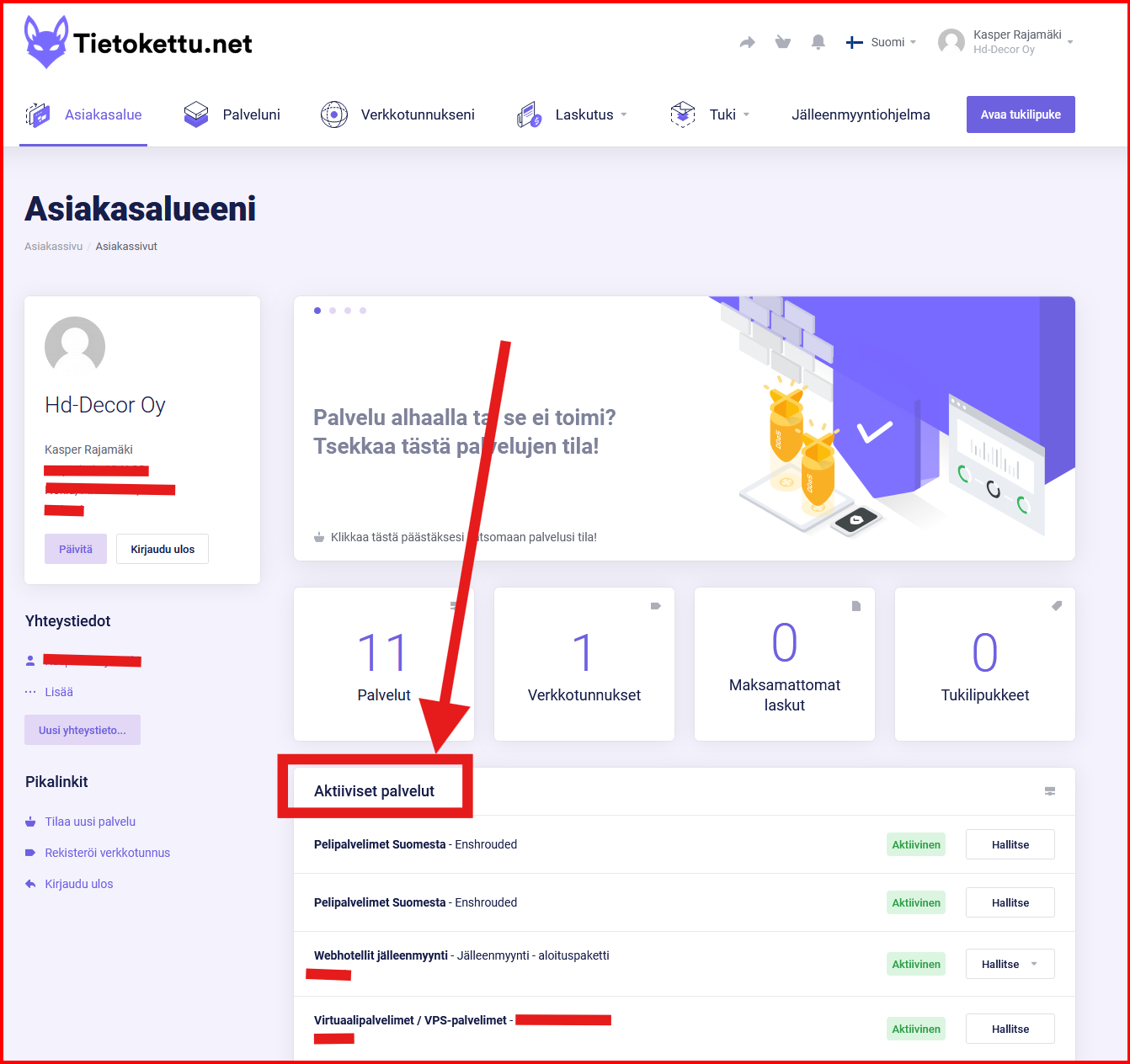 2. Seuraavaksi etsimme asiakasalueelta "Aktiiviset palvelut" kohta.