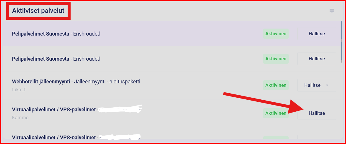 3. Seuraavaksi klikkaamme halutun VPS-palvelimen kohdalta "Hallitse" -nappulaa