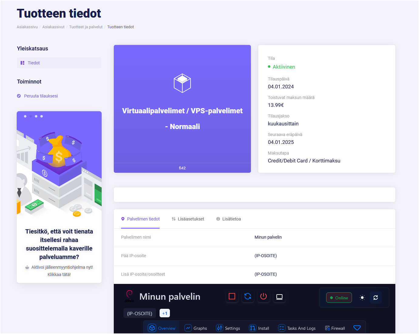 Täällä pääset näkemään monia tietoja kuten "tuotteet ja palvelut", klikkaa siitä ja löydät ostamasi palvelun. Avaa palvelimesi ja pääset "tuotteen tiedot" ikkunaan jossa näet onko se aktiivinen vai odottamassa, jos palvelin on vielä odottamassa sinun pitää odottaa hetki kunnes saamme sen toimintaan.